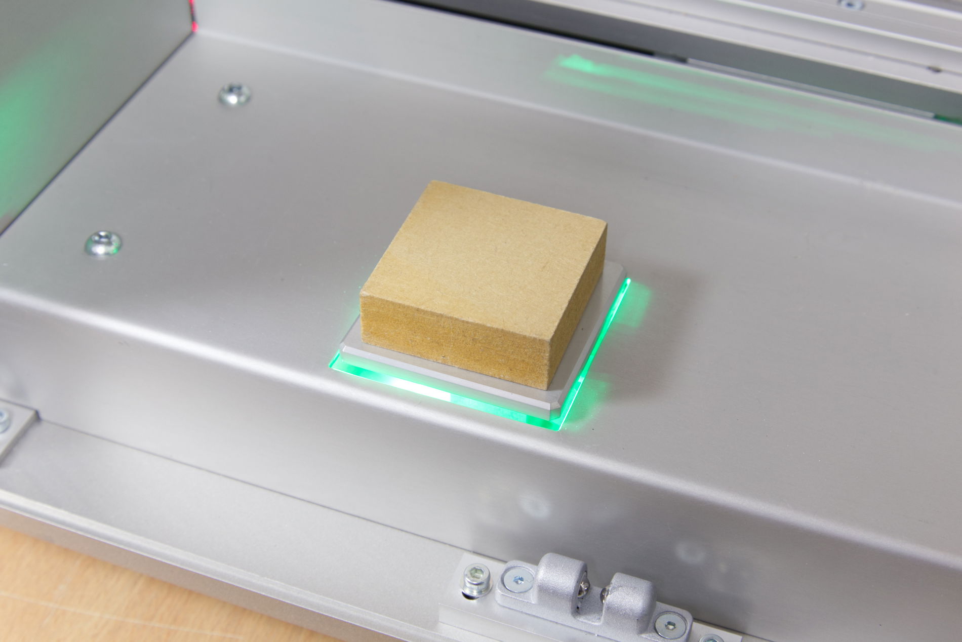 To determine the density distribution across the cross-section of the sample thickness, the sample holder with the samples is guided through the measuring system using a linear slide.