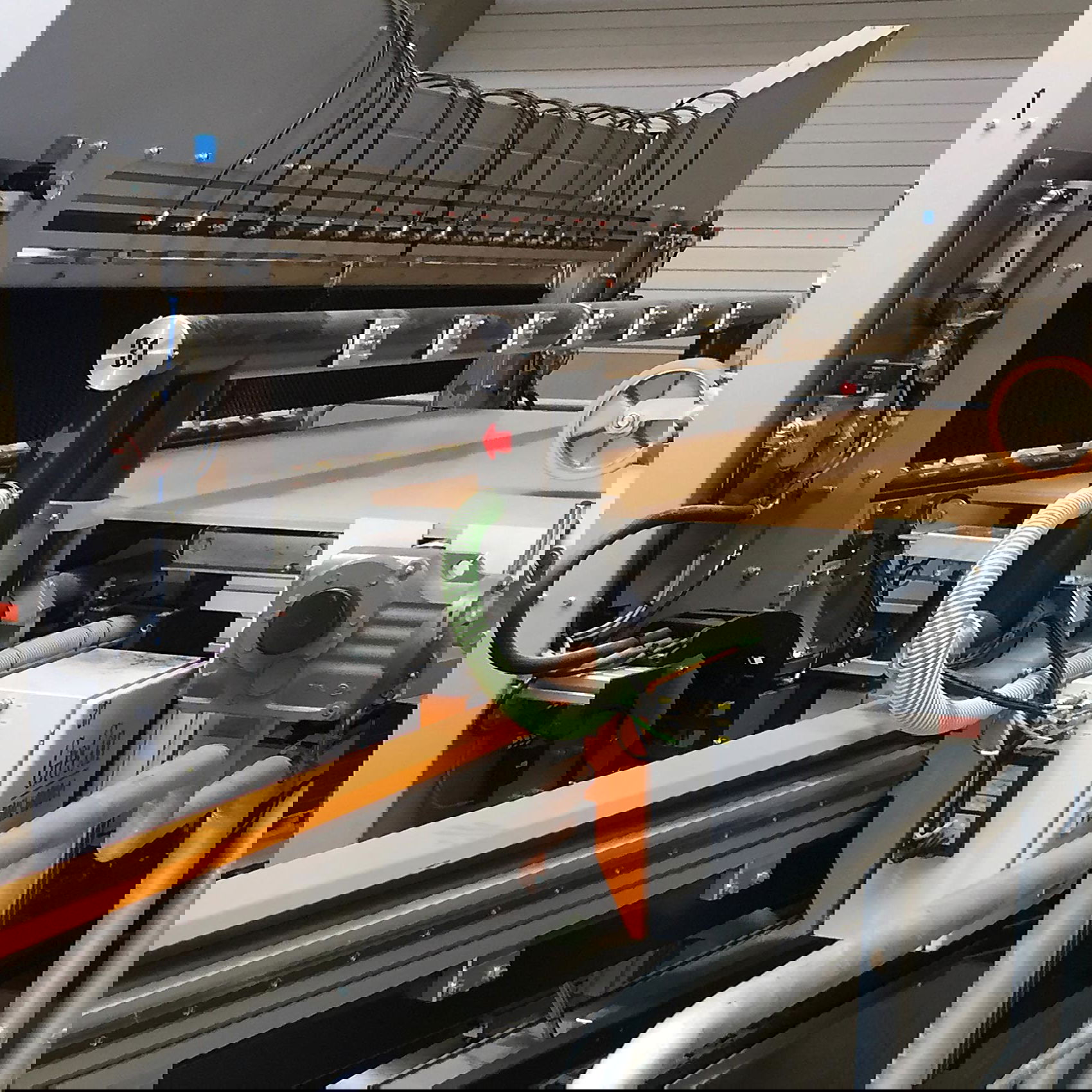 GreCon THICKNESSCONTROL RT with contact measuring heads on production line with person in perspective